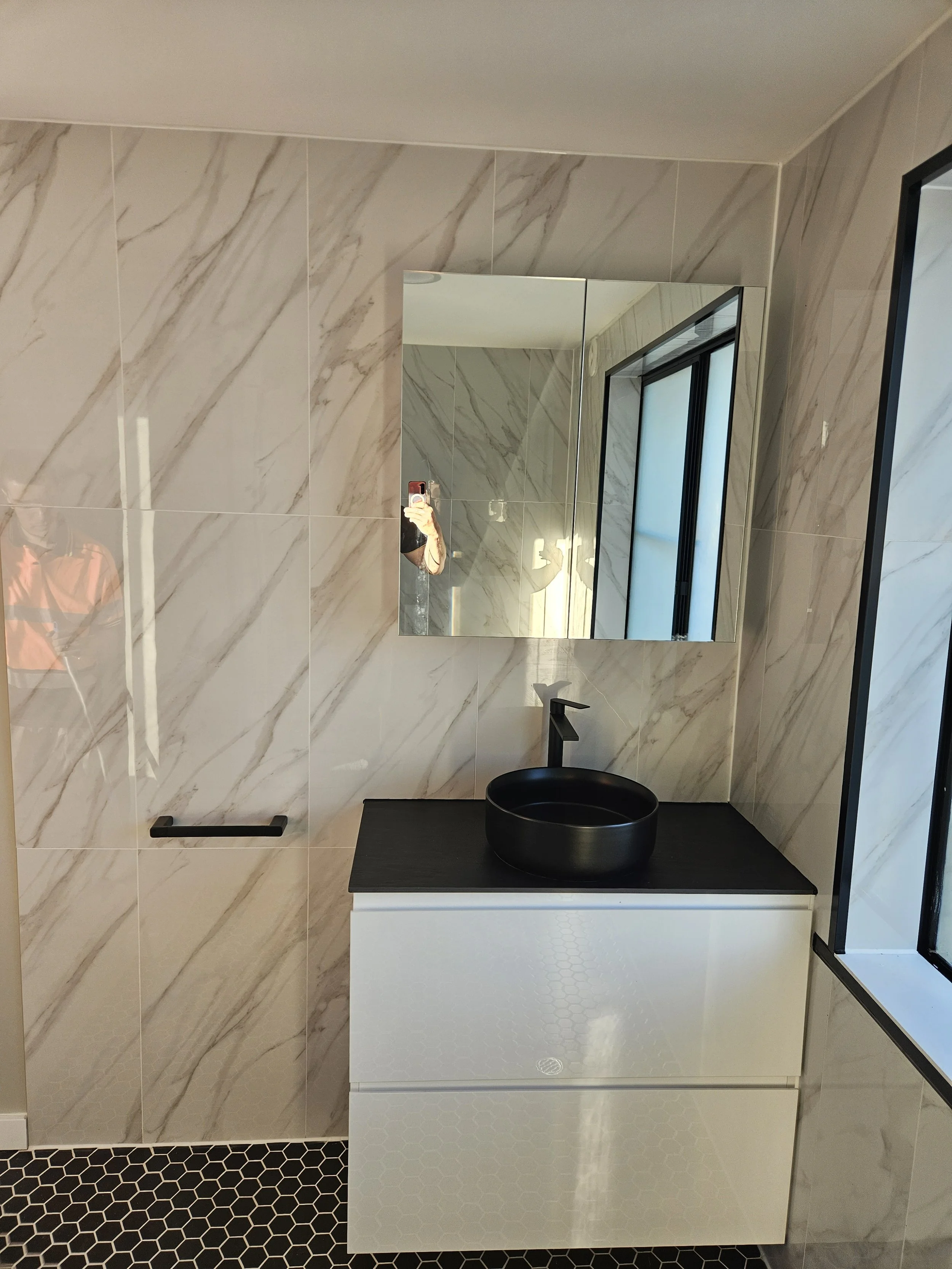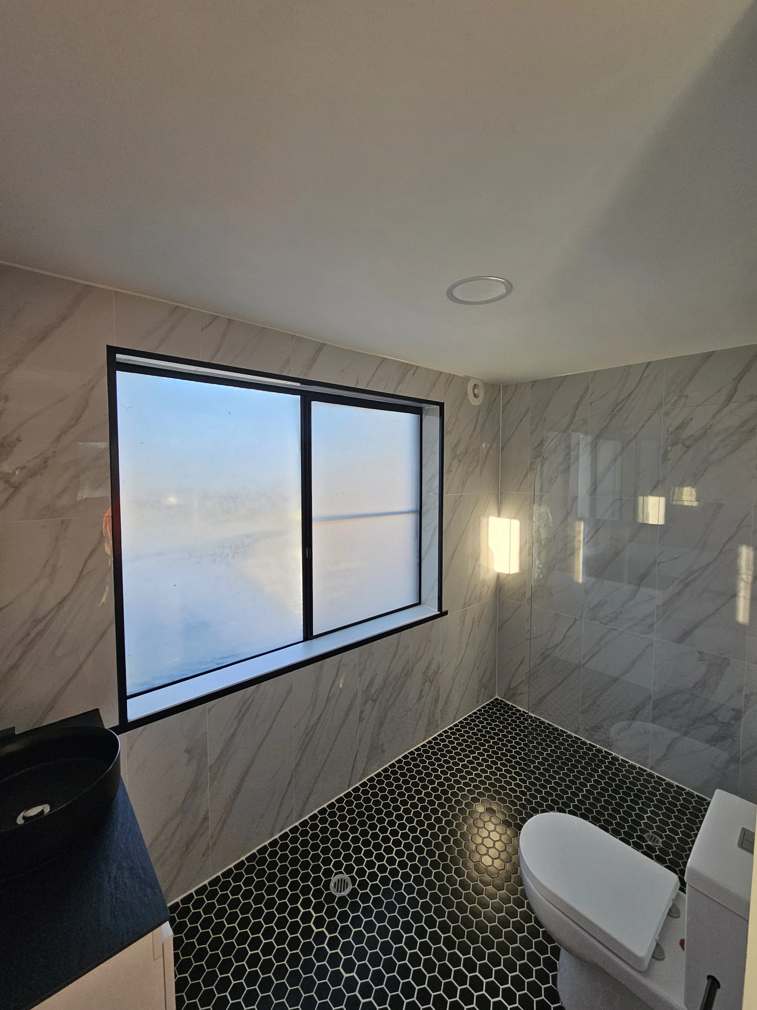 Bathroom for an ensuite on the 2nd floor of the house -Design and install -Reinforcement of floor -Waterproofing and tiling -Vanity, shower screen, toilet and accessories