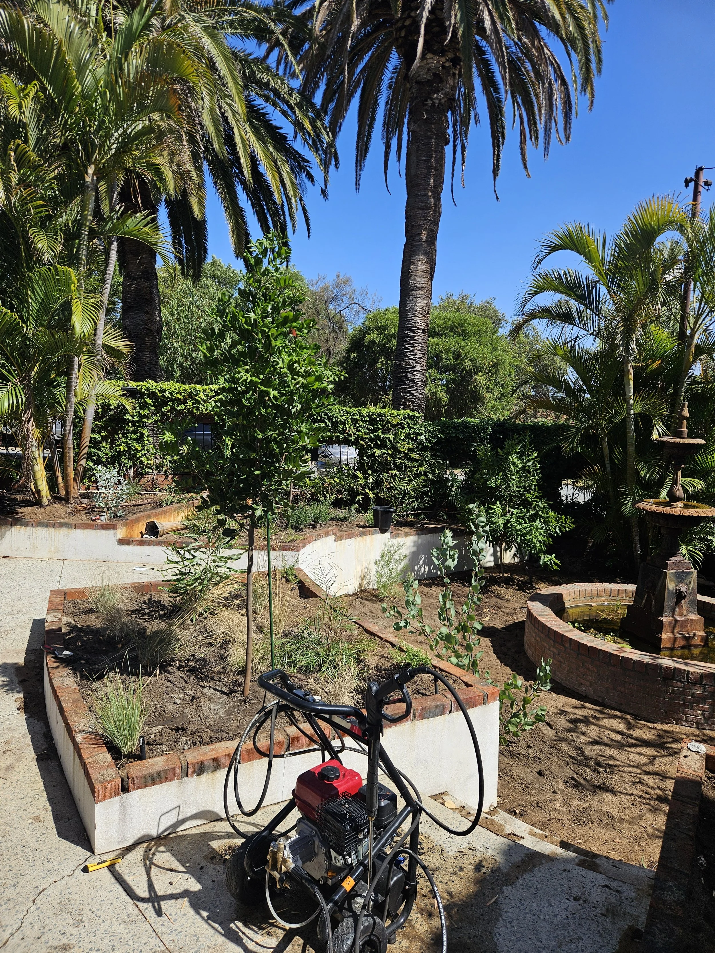 Full front yard remodel -New plants -Removal of old concrete -New plant fence -Fountain cover for child safety -New stepping stones -Fixing retic
